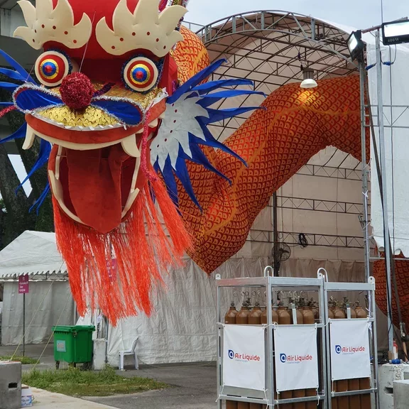 Air Liquide Singapore was proud to be part of Chingay 2020, which took place from 31st January to 1st February New Year at the F1 Pit Building. A total of 1,000m3 of helium balloon gas was used to inflate the Flying Dragon, the main highlight for one of the performances. Weighing up to 90kg and measuring 108 meters long and 2 meters wide, the Dragon was built by 12 craftsmen and took two months to build. It was hailed by its makers to be the world’s largest and longest flying dragon. The performance was helmed by members of China's Xi'an Xiang Long Performing Arts, together with 25 local performers of various ethnicities from Kuo Chuan Art and Cultural (Singapore), a cultural association.